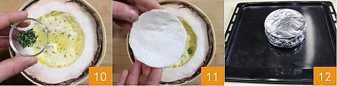 una cucharadita de aceite, el romero picado y las hojitas de tomillo 10. Vuelve a cubrir la forma con la corteza 11, envuelve el vacherin con papel de aluminio 12 y cocina en horno estático precalentado a 200° durante unos 25 minutos (o en horno ventilado a 180° durante unos 20 minutos). Pasado el tiempo necesario, saca del horno tu vacherin al horno con hierbas y sírvelo bien caliente y fundente con las patatas al papillote.