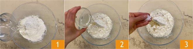 Para preparar los vareniki con cerezas, comenzad con la masa: en un bol poned la harina tamizada, luego añadid el agua tibia 1, el aceite de girasol 2 y una pizca de sal 3.