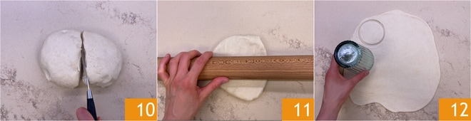 Ahora retomad la masa y divididla por la mitad 10. Estirad ambas partes con un rodillo para obtener 2 láminas de aproximadamente 2 mm de grosor 11. Con un vaso o un cortapastas, formad discos de unos 7,5 cm de diámetro 12.