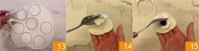Eliminad la masa sobrante 13 que puede ser reamasada para obtener más discos. Rellenad los discos con una cucharada de relleno 14 y una cereza en almíbar 15.