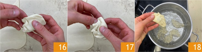 Dobláis los discos por la mitad y cerradlos en forma de media luna, pellizcando los bordes para sellarlos 16 17. Coced los raviolis obtenidos en agua hirviendo a la que habréis añadido una pizca de sal 18. Mientras tanto, derretid la mantequilla y vertedla en un bol.