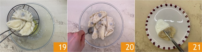 Escurrid los vareniki cuando suban a la superficie, tomará alrededor de 3-4 minutos, luego pasadlos directamente al bol con la mantequilla derretida 19. Mezclad para cubrirlos bien con el condimento 20. Verted una cucharada de nata agria en los platos de servir y colocad encima los vareniki 21.
