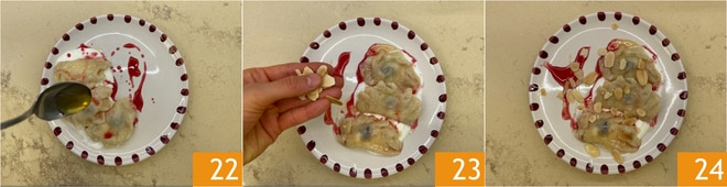 Rociadlos con el líquido de las cerezas en almíbar y la miel 22. Finalmente, adornad con láminas de almendra 23. ¡Vuestros vareniki con cerezas están listos para ser servidos 24!