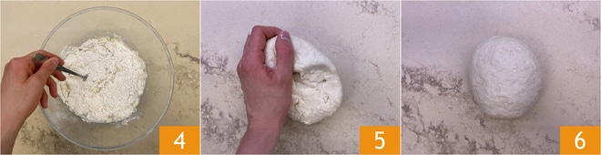 Trabajad primero con un tenedor 4, luego movedos a la superficie de trabajo y amasad con las manos 5 hasta obtener un bollo liso y homogéneo 6. Si la masa está demasiado pegajosa, podéis agregar un poco de harina. Cubrid con film transparente y dejad reposar durante 10 minutos a temperatura ambiente.