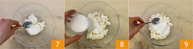 Mientras tanto, preparad el relleno: en un bol poned el tvorog y aplastadlo con una cuchara o un tenedor 7, luego añadid el azúcar 8 y mezclad 9. Probad para ajustar la dulzura según vuestro gusto.
