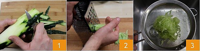 Para preparar los wrap de verduras, empezad con la salsa tzatziki: lavad el pepino y con un cuchillo eliminad la piel, hasta obtener toda la superficie blanca 1. Rallad el pepino con un rallador de agujeros grandes 2, luego pasad la pulpa por un colador, exprimiéndola bien para eliminar el líquido de vegetación 3.