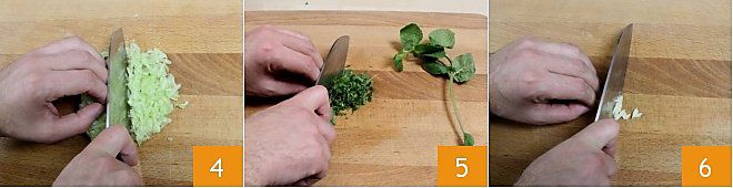 Piquen más finamente el pepino con un cuchillo para obtener una pulpa aún más fina 4. Lavad la menta fresca y picad finamente las hojas 5, finalmente picad el medio diente de ajo 6.