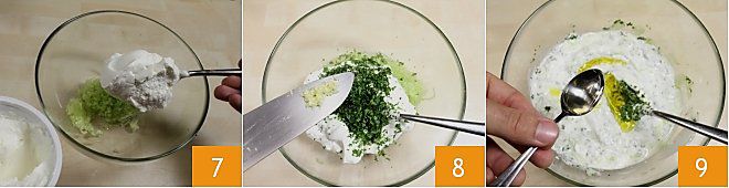 En un bol, verted el pepino picado, añadid el yogur griego y mezclad 7. Luego agregad la menta y el ajo picados 8, la sal, el aceite y el vinagre 9. Mezclad bien todos los ingredientes para obtener una mezcla homogénea. Dejad reposar en la nevera durante media hora la salsa cubierta con film transparente.