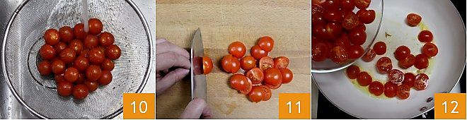 Pasad ahora a cocinar los tomatitos caramelizados: lava bien los tomatitos bajo el agua corriente y córtalos por la mitad 11. En una sartén, sofríe el medio diente de ajo con el aceite. Cuando esté dorado, añade los tomatitos y saltéalos durante 2 minutos a fuego medio 12.