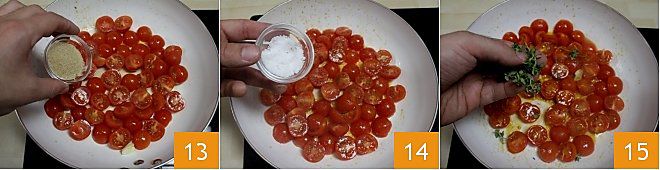 Añadid a los tomatitos en la sartén el azúcar moreno 13, la sal 14 y el tomillo picado a mano 15. Dejad que se ablanden los tomatitos a fuego bajo durante unos diez minutos o hasta que pierdan casi toda su parte acuosa y luego apaguen el fuego. Podéis sustituir los tomatitos caramelizados por Tomatitos confitados (para la receta clicad también Tomatitos confitados).