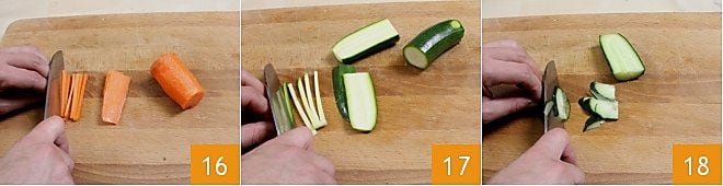 Continuad la preparación de los wrap preparando las otras verduras para el relleno. Para el corte de las verduras podéis consultar la ficha Escuela de cocina: cómo cortar las verduras. Comenzad lavando bien todas las verduras y la ensalada mixta. Pelad las zanahorias y cortadlas finamente a juliana 16. Continuad con los calabacines quitando los dos extremos 17, mientras que el pepino con toda la piel, o sin ella si preferís, deberá cortarse primero por la mitad y luego en rodajas finas diagonales 18.