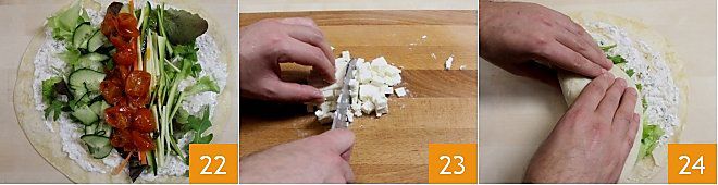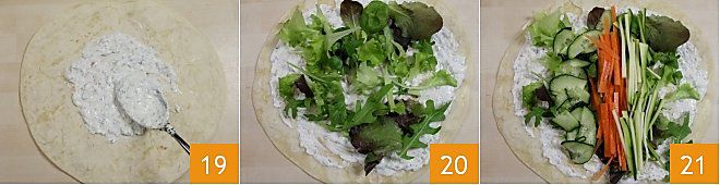Calentad a fuego bajo el fondo de una sartén antiadherente y coloca las tortillas sin manteca de cerdo de un lado, calentándolas por unos segundos para que no se sequen. Luego retíralas del fuego y úntales del lado asado con abundante salsa tzatziki 19. Comenzad a rellenar, colocando en el centro de cada tortilla la mezcla de lechugas (aproximadamente 12 g), los pepinos (aproximadamente 40 g), los calabacines (aproximadamente 30 g) y las zanahorias (aproximadamente 40 g) como se ilustra en las fotos (20-21).