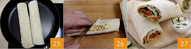 En una sartén antiadherente previamente calentada a fuego bajo, dorad por unos segundos y en todos los lados los wrap obtenidos 25. Luego retíralos del fuego. Para disfrutar más cómodamente de los wrap de verduras podéis cortarlos por la mitad en diagonal 26 y servirlos a vuestro gusto con un poco más de salsa tzatziki aparte 27.