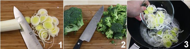 Para preparar la crema de brócolis, empieza limpiando y cortando en rodajas finas el puerro 1. Luego pela las patatas y córtalas en dados. Después lava los brócolis eliminando los tallos y dividiéndolos en floretes 2. En una cacerola grande, pon a derretir la mantequilla, añade los puerros 3 y déjalos pochar a fuego lento durante 10-15 minutos, sin que cojan color.