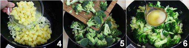 Añade a la cacerola las patatas 4 y los brócolis 5 y déjalos dorar durante unos minutos mezclando, luego añade el caldo vegetal caliente 6 y continúa la cocción durante unos 30 minutos a fuego bajo, salando y pimentando.