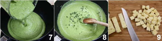 Transcurrido el tiempo indicado, pasa las verduras con una batidora de inmersión (recuerda reservar algunos floretes de brócoli que utilizarás para decorar el plato). Vuelve a poner la crema obtenida al fuego 7, ajusta de sal y añade algunas hojitas de tomillo 8. Quita la corteza de las rebanadas de pan, córtalas en dados 9 y tuéstalos en una sartén antiadherente con un poco de aceite. Sirve la crema de brócolis con los picatostes y un chorrito de aceite de oliva virgen extra en crudo. ¡Buen provecho!