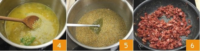 Dejad cocer las lentejas hasta que se vuelvan tiernas, añadiendo caldo cuando sea necesario 4, luego salpimentad. Una vez cocidas las lentejas, eliminad la hoja de laurel 5. Mientras se cuecen las lentejas, tomad el cotechino ya cocido, desmenuzadlo en la sartén y dejad que se ponga crujiente a fuego lento, mezclando de vez en cuando 6.