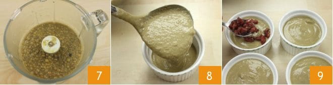 Una vez cocidas, triturad las lentejas en una batidora hasta obtener una crema fina 7. Si os parece demasiado densa, añadid caldo de verduras. Vertedla en 4 cazuelitas pequeñas 8 y añadid en cada una el cotechino desmenuzado 9.