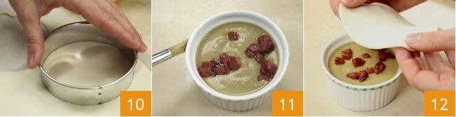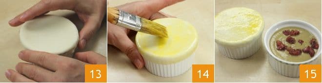Cortad con un cortapastas círculos de hojaldre de un diámetro 1 cm más grande que el de las cazuelitas 10. Humedeced el borde de las cazuelitas con agua y recubridlas con el círculo de hojaldre 12,
