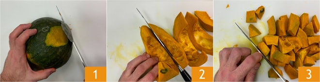 Para preparar la crema de calabaza y queso de cabra, lo primero que hay que hacer es quitar la piel de la calabaza 1 y eliminar las semillas y los filamentos internos. Córtala primero en rodajas 2 y luego en cubos 3.