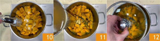 Ajusta de sal y pimienta 10. Vierte en la olla el caldo de verduras 11, lleva a ebullición y luego baja el fuego, tapa 12, y deja cocinar durante 20 minutos o hasta que la calabaza esté tierna.