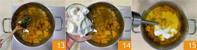 Apaga el fuego, retira el romero, la salvia y el ajo 13 y añade 400 g de queso de cabra 14. Tritura con una batidora de mano 15 hasta obtener una crema lisa y homogénea.