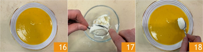Emplata 16. Para cada plato crea, con dos cucharillas, 3 pequeñas quenelles de queso de cabra 17 y colócalas sobre la crema 18.