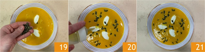 Completa con las semillas de calabaza tostadas 19 y un hilo de aceite 20. Vuestra crema de calabaza y queso de cabra está lista para ser servida 21.