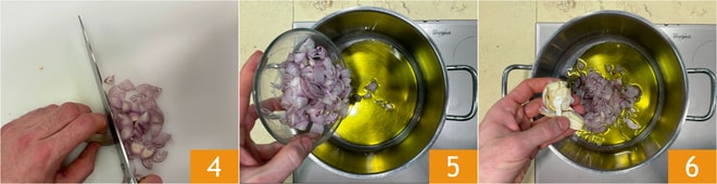Corta la chalota en rodajas finas 4. En una olla calienta el aceite, añade la chalota 5 y el ajo machacado con piel 6.