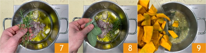 Incorpora el romero 7, la salvia 8 y deja sofreír durante 2 minutos. Añade la calabaza 9 y cocina durante 5-7 minutos, a fuego alto, removiendo a menudo.
