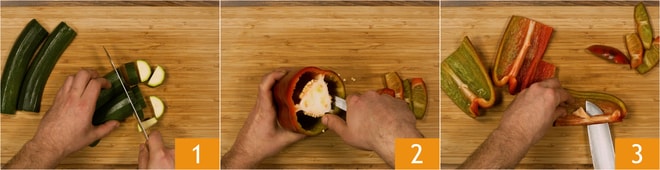Para preparar las verduras al horno fáciles, lo primero que tienes que hacer es lavarlas todas. Corta los extremos de los calabacines, pártelos por la mitad a lo largo y después en rodajas de aproximadamente 1,5 cm de grosor. Pasa a los pimientos, elimina la parte superior y quita la parte con las semillas 2. Córtalos en 4 y elimina también los filamentos blancos 3.