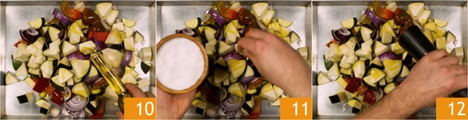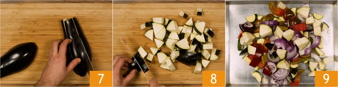 Ahora pasa a las berenjenas. Primero córtalas en rodajas 7 y luego en trozos 8. Añade a la bandeja junto con las otras verduras también las cebollas y las berenjenas 9.