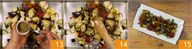 Añade una pizca de orégano 13 y dos dientes de ajo enteros sin pelar 14. Mezcla muy bien para condimentar todas las verduras. Cocina en horno estático precalentado a 190° durante unos 40-45 minutos o hasta que las verduras estén bien cocidas y doradas. Saca del horno y sirve 15.