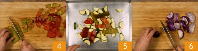 Obtén tiras largas 4. Mientras tanto, coloca en una bandeja lo suficientemente amplia tanto los calabacines como los pimientos 5. Ahora pasa a las cebollas, pélalas y córtalas en rodajas de 1 cm de grosor 6.