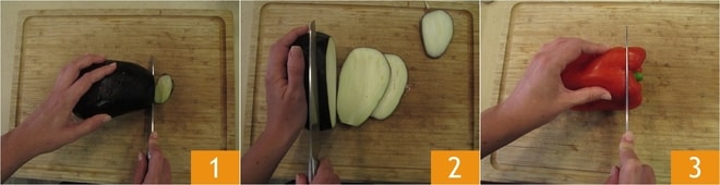 Para preparar las verduras gratinadas al horno, lo primero es lavar las verduras. Tomad la berenjena, quitadle el extremo 1 y cortadla en rodajas de 7-8 mm de grosor a lo largo 2. Pasad al pimiento, eliminad la parte superior 8 y las semillas internas.