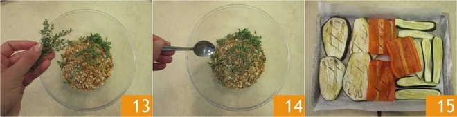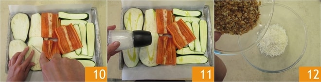 Haced incisiones en las verduras con un cuchillo 10 y condimentad con sal y aceite 11. Coced en horno estático precalentado a 180° en la rejilla central durante 30 minutos. Mientras tanto, preparad el empanado. En un bol, verted el queso rallado y añadid el pan rallado grueso 12.