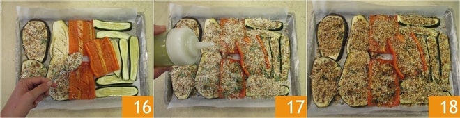 Añadid encima el empanado 16 y un chorrito de aceite 17. Coced durante otros 10-12 minutos, siempre a 180°, luego trasladad la bandeja a la parte alta del horno y activad el grill por un par de minutos hasta que estén bien doradas. Sacad del horno 18 y servid vuestras verduras al horno gratinadas.