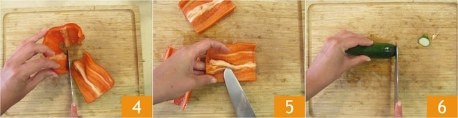 Divididlo en 3 piezas grandes 4 y eliminad los filamentos internos 5, luego aplastadlos ligeramente para aplanarlos. Quitad los extremos de los calabacines 6.