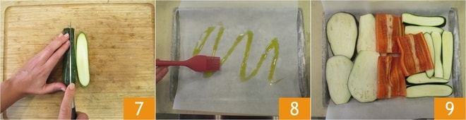 Cortadlos en rodajas de 5-6 mm de grosor 7. Forrad una bandeja con papel de horno y untadla con aceite 8, de esta manera las verduras se condimentarán también por debajo. Colocadlas dentro de la bandeja, no hay problema si se superponen ligeramente 9.
