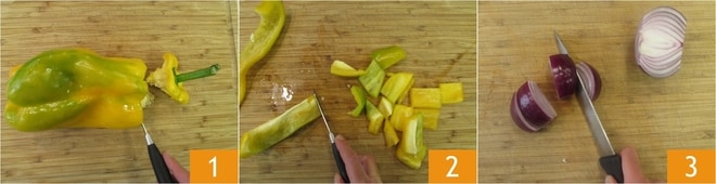Para preparar los verzini al bbq con pimientos y cebollas, primero lava los pimientos, quita la tapa y las semillas internas 1, luego córtalos en trozos de aproximadamente 2 cm 2. Limpia y corta también las cebollas rojas en trozos de 2 cm 3.