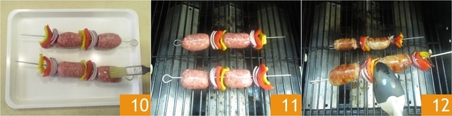 Pincela las brochetas con aceite de oliva 10. Calienta el bbq, que debe alcanzar una temperatura de unos 250°. Coloca las brochetas 11, cocina durante 18 minutos, asegurándote de girarlas cada 4 minutos aproximadamente, para dorarlas de manera homogénea 12.