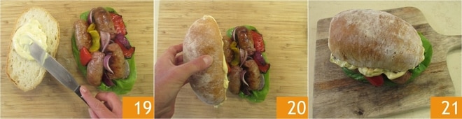 Unta la mayonesa también en la otra rebanada de pan 19. Cierra el bocadillo 20 y disfruta de los verzini al bbq con pimientos y cebollas en tu bocadillo bien caliente 21!