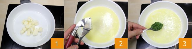 Para preparar las vieiras gratinadas con mantequilla y brandy, coloca la mantequilla en trozos en una sartén, donde se derretirá a fuego bajo durante unos minutos 1; añade luego un diente de ajo machacado 2, deja que dore (siempre a fuego lento), añade el perejil picado y retira la sartén del fuego 3.