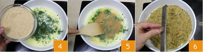 Añade, poco a poco, el pan rallado 4, continuando a mezclar 5, hasta que obtengas una mezcla homogénea; ajusta de sal y pimienta, y luego aromatiza todo rallando nuez moscada 6.