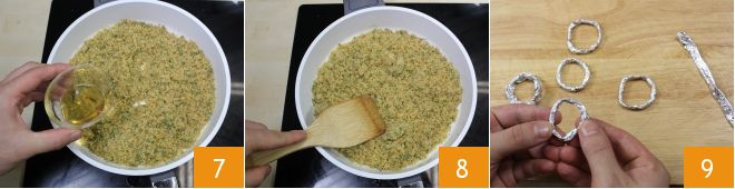 Humedece la mezcla con 30 gr de brandy (un vasito) 7 y mezcla para amalgamar todos los ingredientes 8 (si la mezcla resultara demasiado seca, añade unas gotas de agua tibia). Prepara ahora el soporte para las vieiras: enrolla tiras de aluminio para formar círculos 9 que colocarás en el fondo de las conchas antes de insertar las vieiras (de esta manera evitarás que los moluscos se muevan durante la cocción y que el relleno se derrame).
