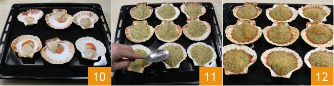 Toma las vieiras ya limpias y colócalas en las conchas 10, que previamente has puesto en una bandeja de horno. Añade una cucharada y media de la mezcla con pan rallado y brandy en cada concha, nivelando bien la superficie con la parte de atrás de una cuchara 11, luego hornea todo en horno estático precalentado, a 220° durante 5 minutos. Transcurrido este tiempo, coloca las vieiras bajo el grill por otros 5 minutos: deberán quedar doradas 12. ¡Las vieiras gratinadas con mantequilla y brandy están listas, sírvelas aún calientes!