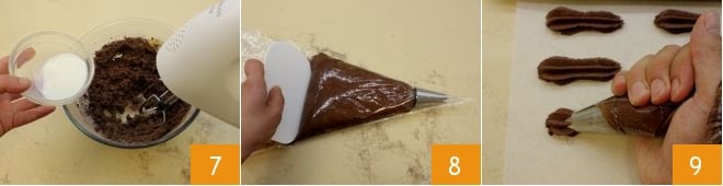luego añade la leche 7 y mezcla nuevamente; deberás obtener una masa ni demasiado dura ni demasiado líquida, con una consistencia mantecosa. Transfiérelo a una manga pastelera con boquilla de estrella bastante ancha 8; coloca una hoja de papel de horno en una bandeja para hornear, luego comienza a formar las galletas de 5-6 cm de largo 9,