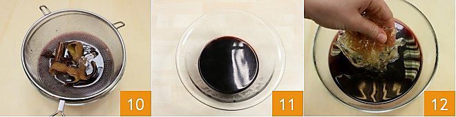 Dejad escurrir bien el líquido del colador que ha retenido las especias y las cáscaras de cítricos usadas en la cocción 10; dejad que el compuesto se temple 11. Luego, retomad las hojas de gelatina que habéis dejado en remojo, escurridlas cuidadosamente y vertedlas en el vino templado 12.