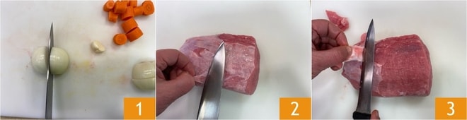 Para preparar la ternera con salsa de atún light, comenzad limpiando y cortando en trozos grandes la zanahoria y la cebolla 1. Eliminad los tejidos conectivos superficiales de la ternera 2, usando una cuchilla lisa y teniendo cuidado de no retirar carne. 3.
