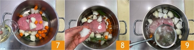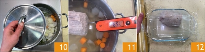 En este punto, cerrad con la tapa 10 y dejad hervir a fuego lento durante 30-35 minutos o hasta que la carne alcance una temperatura interna de 65° 11. Una vez cocida la carne, escurridla y dejad enfriar completamente cubriendo con film transparente 12.